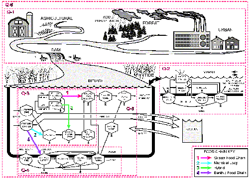 The model illustrates the possible interactions of inorganic nutrients with the quantity and quality of organic matter and their affect on trophic structure and trophic efficiency. Four major organic matter and nutrient pathways are portrayed: 1) the classical grazing food chain: inorganic nutrients - phytoplankton > 20 µm - macrozooplankton - planktivores - piscivores, 2) the microbial loop: organic matter - bacteria - microflagellates - microzooplankton - macrozooplankton - planktivores - piscivores, 3) a hybrid of the grazing food chain and the microbial loop: inorganic nutrients - phytoplankton < 20 µm - microflagellates - microzooplankton (the microbial loop) - macrozooplankton - planktivores - piscivores, and 4) a benthic food chain: organic matter - to sediments - bacteria - benthic meio - and macrofauna - benthivores - piscivores. The degree and rate at which organic matter flows through one pathway or another depends largely on the quality of the organic matter being decomposed and the availability of inorganic nutrients. High organic matter loading stimulates the microbial loop at the expense of phytoplankton while high nutrient loading stimulates the grazing food chain. We expect trophic efficiency to be partially controlled by organic matter quality and availability of inorganic nutrients for bacteria.